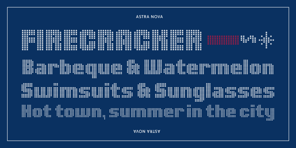 Astra Nova is a revitalized classic Americana typeface by François Robert. Following his typeface Baudot, Astra Nova was first introduced in 1969 under the name “Astra” in the rub-down type (dry transfer) format. This iconic display type is now available as a 21st Century digital font ready to once again perform its duty inspiring hope and positivity.