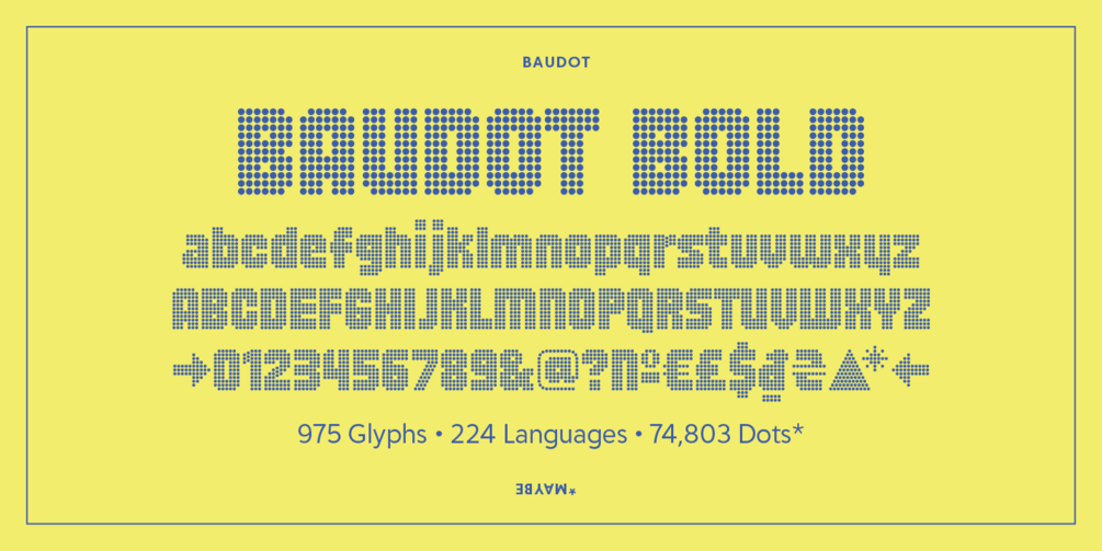 The result: “Baudot” [boˈdo] is comprised of three weights: Light, Regular, and Bold, plus two styles for color layering. As one would expect of today’s fonts, Baudot has handy OpenType features and a broad repertoire of 975 glyphs with support for 224 languages, including Vietnamese, Greek, plus Cyrillic script.