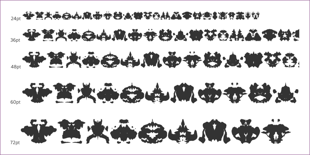 Inspired by the work of the noted Swiss Freudian psychiatrist and psychoanalyst Hermann Rorschach [1885-1922], Blot Test is a symbol font comprised of 52 fascinating vectorized ink blot glyphs. Rorschach’s famous 10 ink blots were introduced in 1921, in a monograph called Psychodiagnostik. It garnered much attention and the “Rorschach Ink Blot Test” became the clinical psychologists’ preferred test during the 1940s–‘50s. The test reportedly reflected unconscious parts of the personality that “project” onto the stimuli (ink blots) and subjects reported what objects or figures they see in them.
