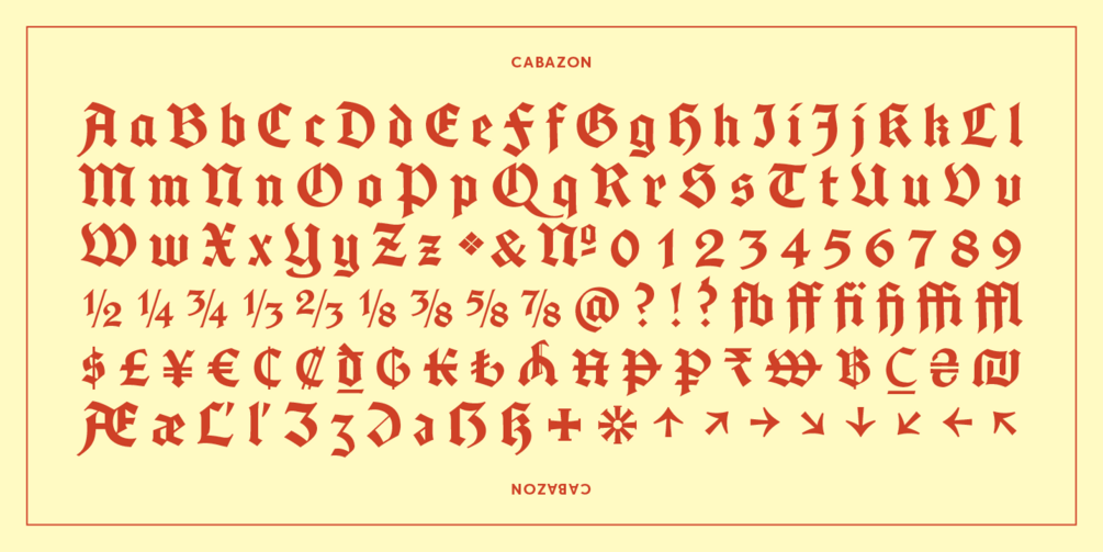 Many of the forms in Cabazon are simplified compared to other blackletter styles. Cabazon retains the warmth of handlettered forms and evokes a more casual feel with a bit of swagger but it certainly doesn't take itself too seriously. Parkinson’s own experience creating numerous blackletter nameplates for newspapers spanning several decades of his career informed his effort in producing this delightful type.