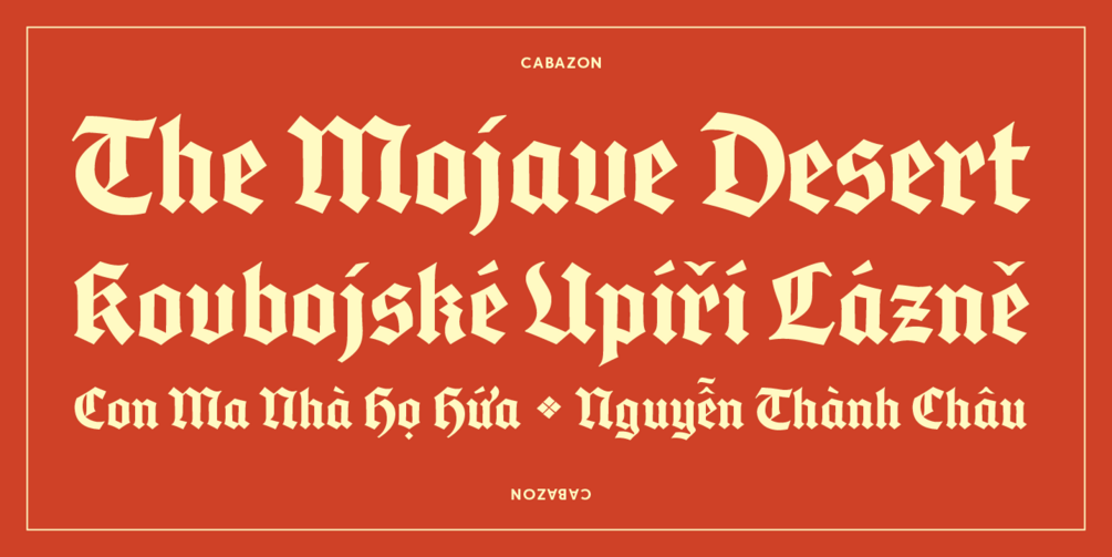 This update (v3.0) for Cabazon expands the glyph repertoire to over 1,000 glyphs supporting 224+ languages, including Vietnamese, African, and Oceanian languages. Among all those new glyphs, are a selection of stylistic alternates, liga- tures, arrows, symbols, and more. Opentype features are built in to make accessing all those glyphs quick and convenient.