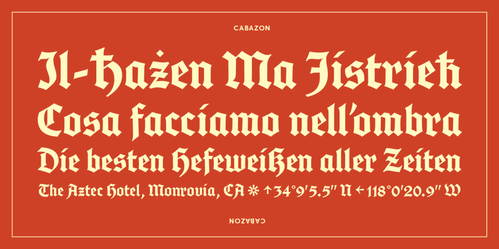 Many of the forms in Cabazon are simplified compared to other blackletter styles. Cabazon retains the warmth of handlettered forms and evokes a more casual feel with a bit of swagger but it certainly doesn't take itself too seriously. Parkinson’s own experience creating numerous blackletter nameplates for newspapers spanning several decades of his career informed his effort in producing this delightful type.