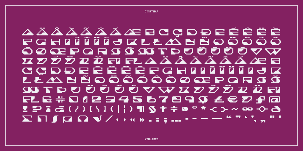 Serendipity often occurs in typefaces from the hand of the award-winning type designer, Joachim Müller-Lancé. The design of Cortina was inspired by a small shape spotted by coincidence: a tiny triangular tab in a software panel that resembled a futuristic ‘A’. Joachim developed the entire concept from this idea into a family of three styles: Cortina Base, Slate, and Plate. Each is modeled on the same conceptual form sharing proportions, but with different features.