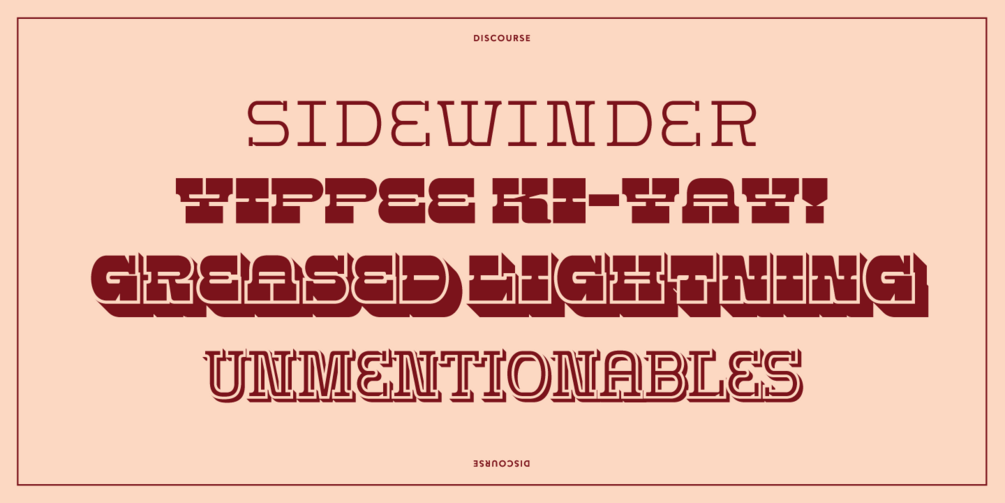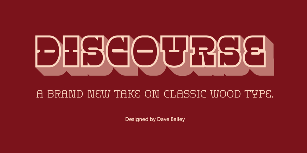 Although it references classic reverse-contrast wood type associated with the era of the Wild West, the Discourse Heavy Set by Dave Bailey is the opposite extreme of the Light Set. These three heavy versions of Discourse concentrate on creating the highest visual impact with the darkest color possible and tight spacing.