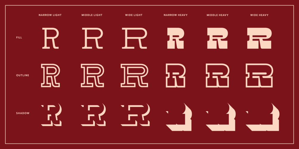 Discourse Heavy Set is a package of three widths: Heavy Narrow, Middle, and Wide. The package also includes the Shadow, Outline, and Fill versions for each of the three widths (12 fonts total) that can be layered for a fun chromatic effect.