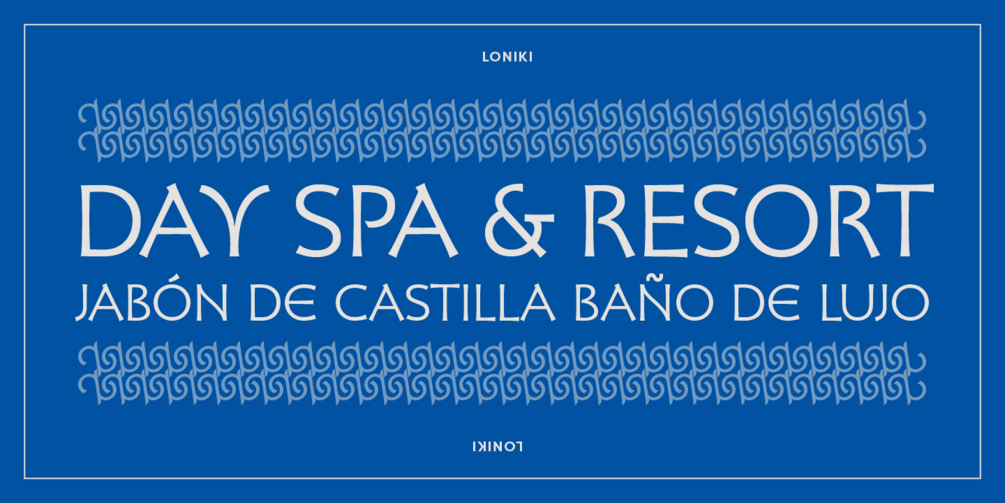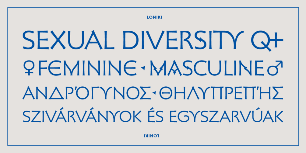 Available in two styles: Regular and Symbols, Loniki is not only distinctive and beautiful, it is also one of the most versatile display fonts. The large glyph repertoire of Loniki supports 229 languages, including Greek, Polytonic Greek, Coptic, Vietnamese, and a panoply of African languages. And with Loniki, you can readily shift stylistic expression to a remarkable degree simply by selecting from among the discretionary ligatures and plentiful stylistic alternates, allowing the cultural mood of the design to change from classical to gothic or blend them as you like.