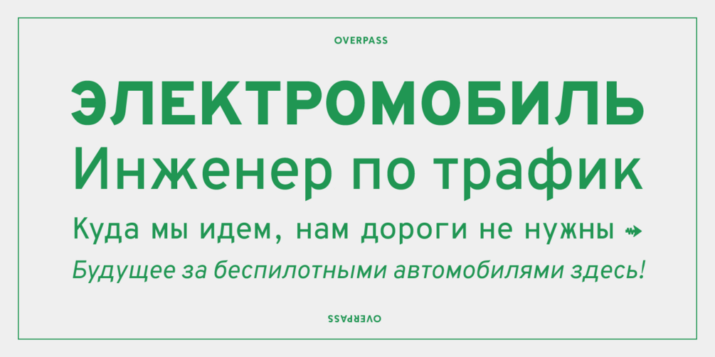 The design of Overpass is an interpretation of the well-known letterforms from the Standard Alphabets for Traffic Control Devices published by the U.S. Federal Highway Administration. Starting from those original drawing specifications, critical adjustments were made to yield optimal results for on screen text and in the more extreme weights, for use at display sizes.