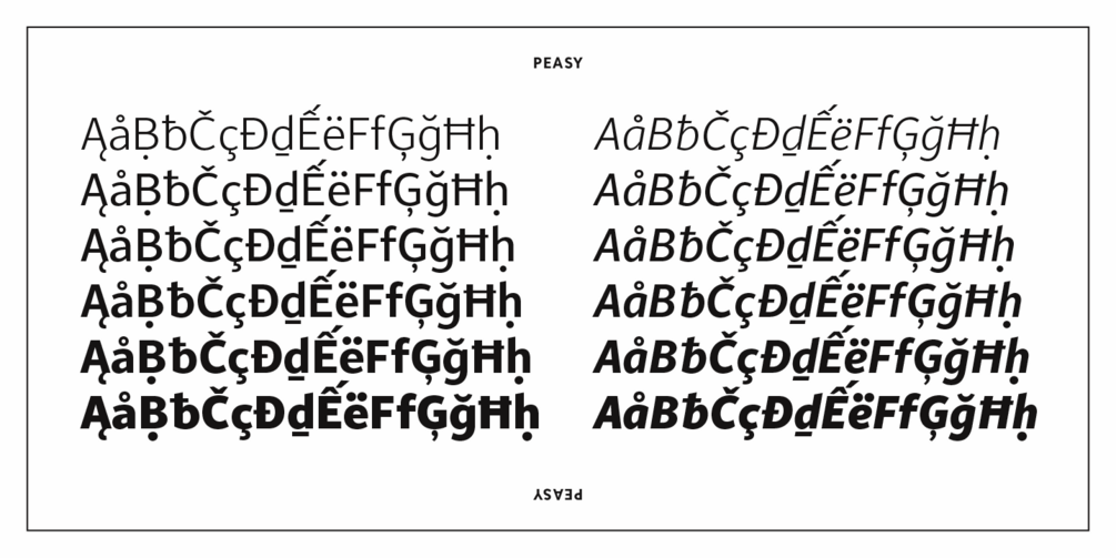 Having an even color with just enough flair (and flare) to make for a pleasant reading experience, Peasy fits a wide range of graphic design applications. It is an excellent choice for use in both print and online publications, signage, user interfaces, or other texts where readability is critical.