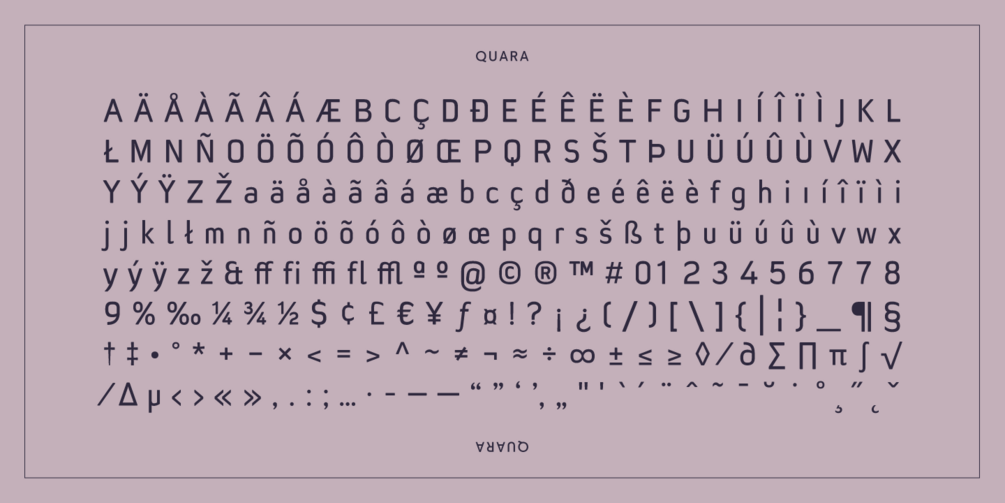 The compact, square-ish architecture, low contrast, and slight rounding of corners sets Quara apart from other sans serifs. It is scaleable in the sense that it can be used at larger sizes for titles and headlines, in layouts for magazines, pamphlets, posters, and postcards. And while it is distinctive enough to serve in display settings it maintains a versatility that allows it to perform well at intermediate and text sizes in shorter passages of copy.