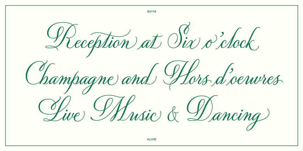 Penned by master calligrapher Xandra Y. Zamora, Quita is a luxurious script that lends an artistic elegance and a sense of refinement to any setting. Xandra’s expertise with the pointed pen is apparent in the confident curves and magnificent flourishes seen throughout the typeface.