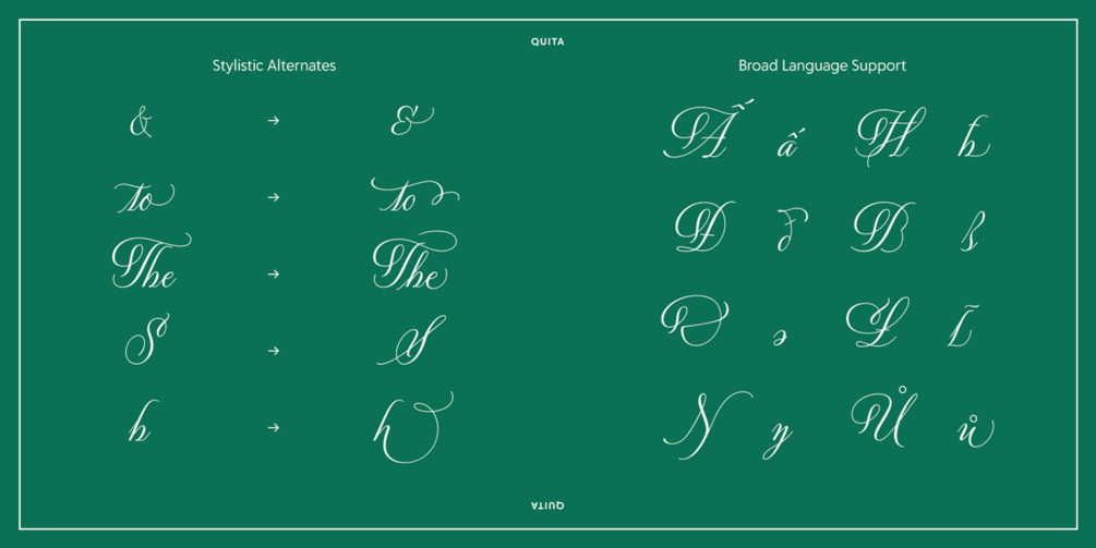 Delve Fonts accurately captured and faithfully reproduced the vivacious letterforms as a connected script. Alternate letterforms were included to invisibly achieve harmonious spacing among any combination of letters. The best part is: they are automatically applied as you type, giving you great typesetting right out of the box. Further customize your message by applying some of the many stylistic alternates, discretionary ligatures, and swash variants available in Quita’s character set.