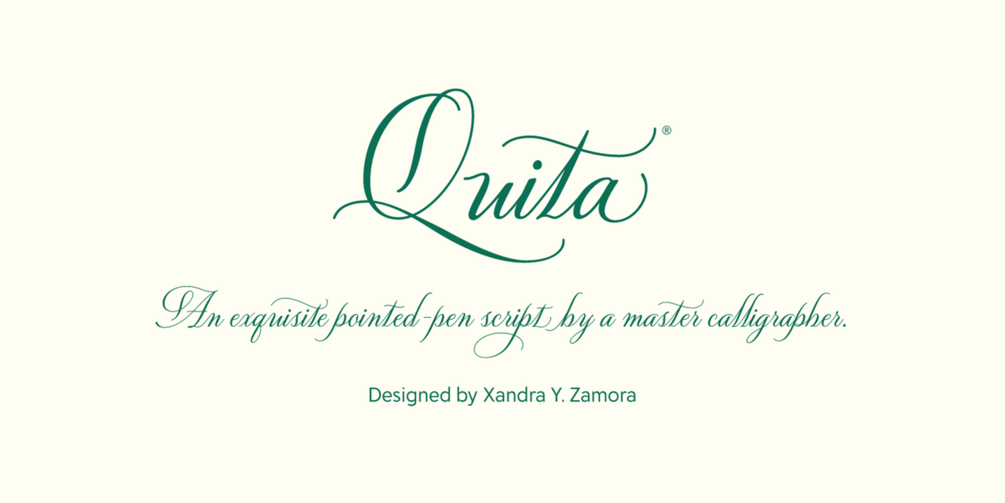 Penned by master calligrapher Xandra Y. Zamora, Quita is a luxurious script that lends an artistic elegance and a sense of refinement to any setting. Xandra’s expertise with the pointed pen is apparent in the confident curves and magnificent flourishes seen throughout the typeface.