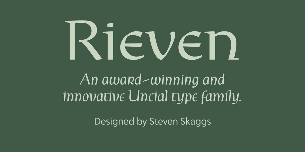 If a sans serif roman and an uncial got together and had a type-baby, it would be Rieven Uncial. While it retains a richness and elegance found in traditional uncial forms, Rieven Uncial has been carefully tempered by designer Steven Skaggs to be much more versatile. This italic version works perfectly well with its uncial cousin despite being structurally quite distinct from it.