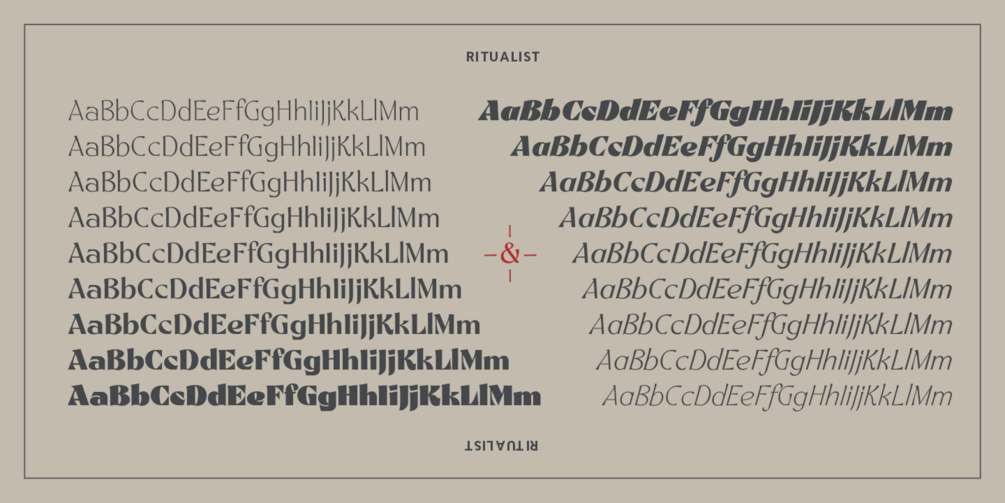 Use Ritualist as your new secret weapon when the creative brief requires your designs to give vibes of intrigue, darker desires, and mystical encounters. Set it large for arresting headlines and titles that dominate while preserving the mood with middle range of weights for subheads and brief bits of copy. Careful though, you may become obsessed with Ritualist — or so we hope.