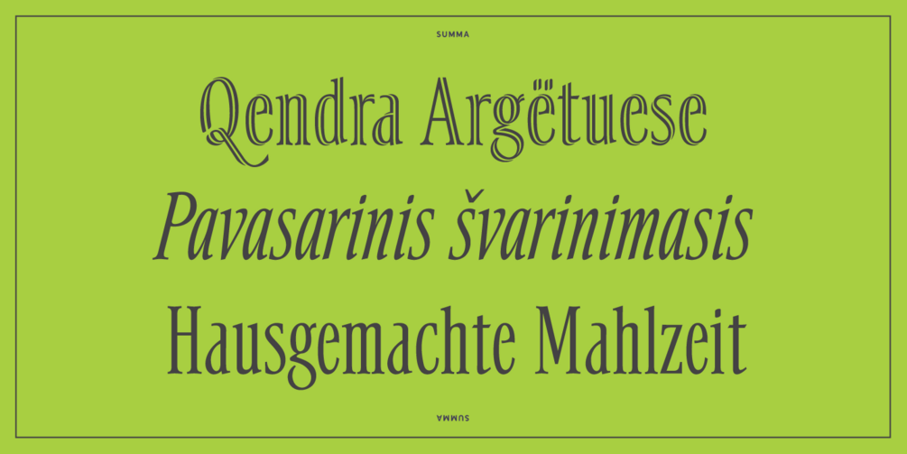 Summa’s height and compact measure make it an ideal choice for use in headlines, book titles, on posters, for drop-caps, and other instances where large display sizes are needed in tight spaces but heavy weights are not desired.