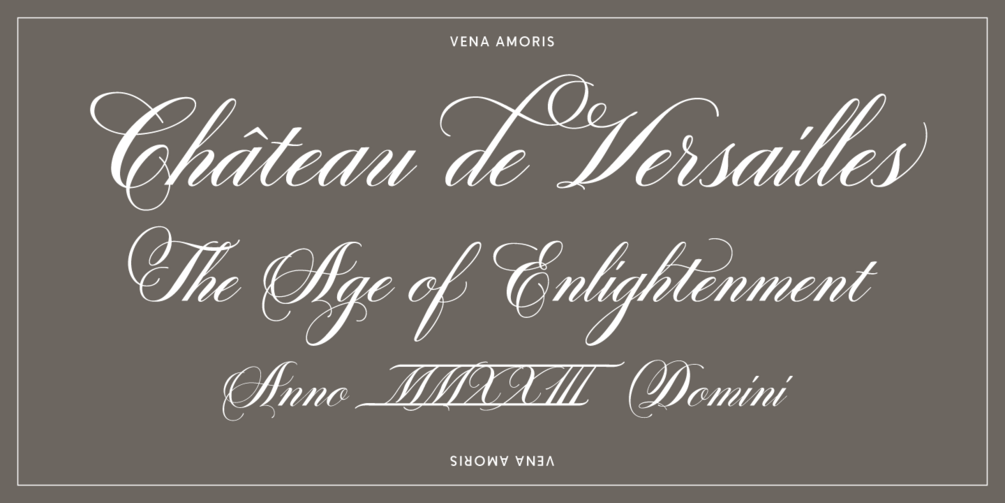 As a digital font, Vena Amoris boasts an extensive Latin-based character set with stylistic and contextual alternates, ligatures swash variants, a set of oldstyle figures, and roman numerals. All driven by cleverly applied OpenType features allowing you to effortlessly add harmony and calligraphic beauty to your layout.