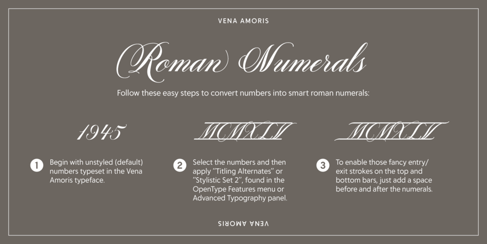 As a digital font, Vena Amoris boasts an extensive Latin-based character set with stylistic and contextual alternates, ligatures swash variants, a set of oldstyle figures, and roman numerals. All driven by cleverly applied OpenType features allowing you to effortlessly add harmony and calligraphic beauty to your layout.