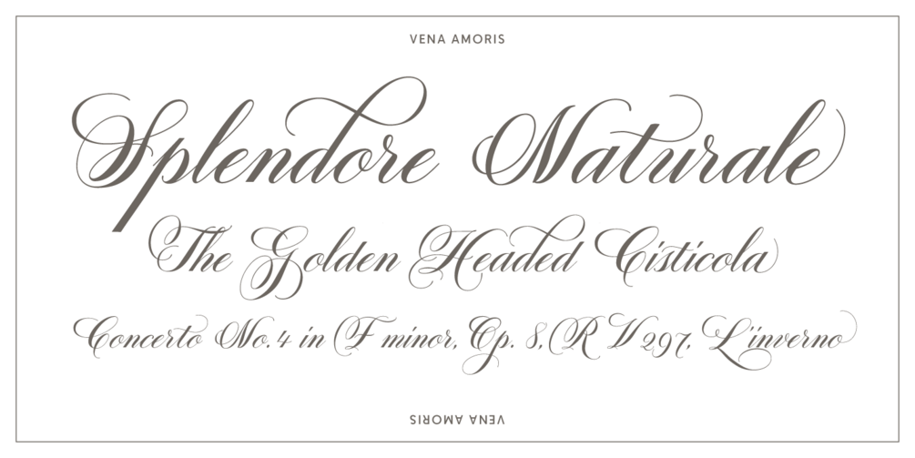 As a digital font, Vena Amoris boasts an extensive Latin-based character set with stylistic and contextual alternates, ligatures swash variants, a set of oldstyle figures, and roman numerals. All driven by cleverly applied OpenType features allowing you to effortlessly add harmony and calligraphic beauty to your layout.
